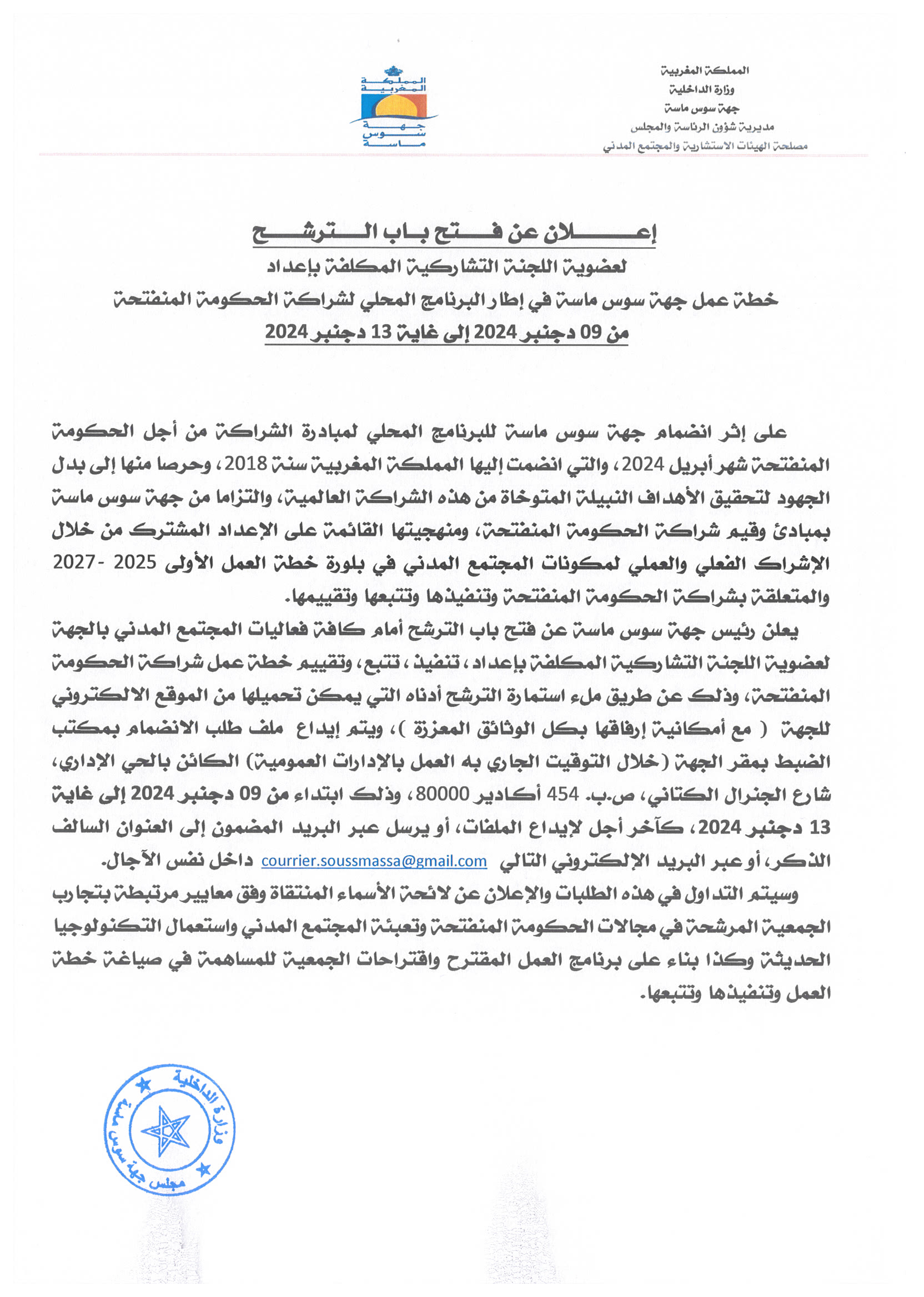 إعلان عن فتح باب الترشح لعضوية اللجنة التشاركية المكلفة بإعداد خطة عمل جهة سوس ماسة في إطار البرنامج المحلي لشراكة الحكومة المنفتحة من 09 دجنبر 2024 إلى غاية 13 دجنبر 2024