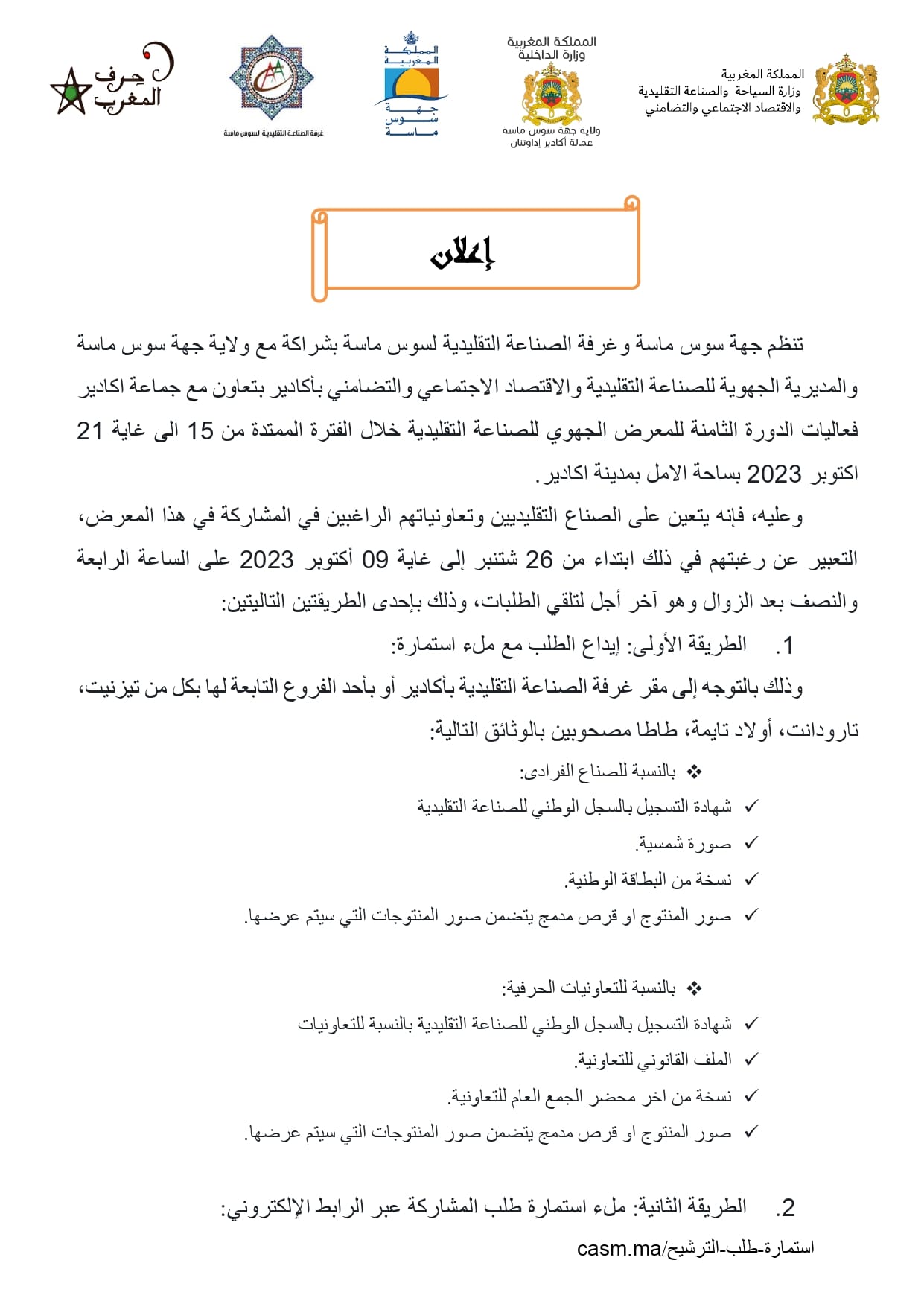 تنظم جهة سوس ماسة وغرفة الصناعة التقليدية لسوس ماسة بشراكة مع ولاية جهة سوس ماسة والمديرية الجهوية للصناعة التقليدية والاقتصاد الاجتماعي والتضامني بأكادير بتعاون مع جماعة اكادير فعاليات الدورة الثامنة للمعرض الجهوي للصناعة التقليدية خلال الفترة الممتدة من 15 الى غاية 21 اكتوبر 2023 بساحة الامل بمدينة اكادير.